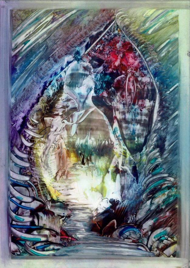 More white blank A4 card, more wondering what to do. Again, the wax started to melt on the iron and unplanned strokes divulged fresh stimulus to the awaiting mind. A central structure gave information, a starting point for development, a launch pad into a dream of creative discovery. The garden found its way into my…