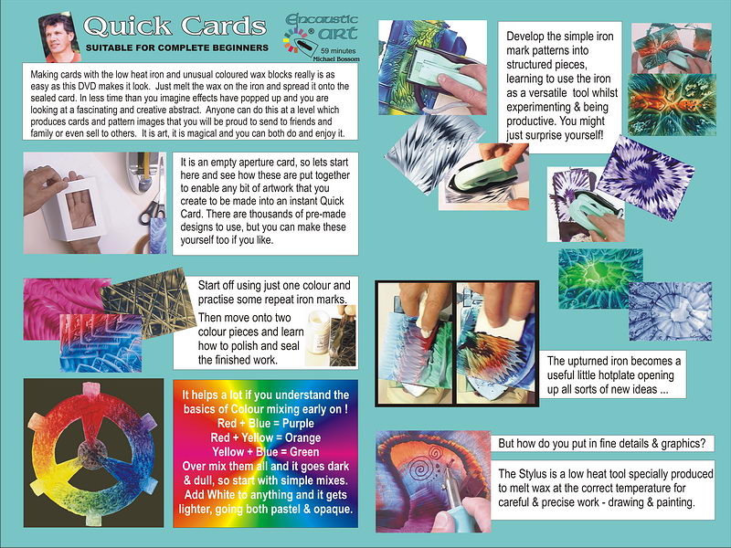 This DVD - Quick Cards - centers around using the iron in various ways to create abstract & patterned results that are ideal for mounting into aperture cards as greetings cards.